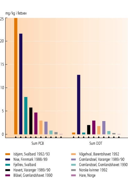 - Figur 15.11 Bio-akkumulering av PCB og DDT i marine pattedyr. Gjennomsnittlig nivå av sum PCB og DDT (mg/kg våtvekt) i fettvev. (Kilde: Skaare m.fl. 1994.)