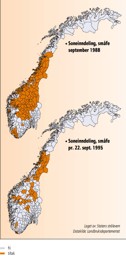 - Figur 15.12 Oversikt over hvilke kommuner i Norge der tiltak for å redusere nivåene av radioaktiv forurensning ble gjennomført for småfe i 1988 og i 1995.