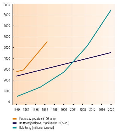 - Figur 15.13 Forbruket av plantevernmidler i Asia relatert til faktisk og forventet utvikling i befolkningstall og BNP. (Kilde: UNEP/FAO og UNDP)