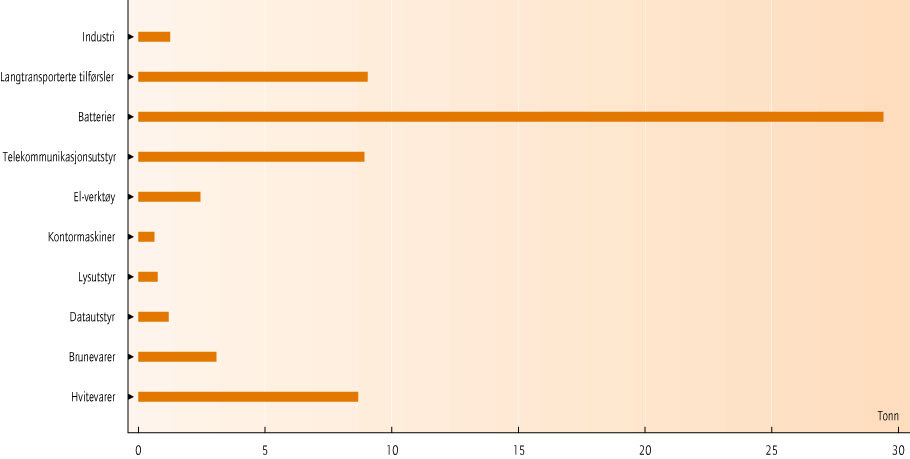 Figur 15.4 illustrerer betydningen av produkter som kilde for utslipp av helse- og miljøfarlige kjemikalier. Den viser årlig innhold av kadmium i avfall fra elektriske og elektroniske produkter sammenlignet med totale årlige kadmiumutslipp fra norsk industri og årlige langtransporterte kadmiumtilførsler. Tallene er ikke direkte sammenlignbare. Industriutslipp og langtransporterte tilførsler innebærer direkte utslipp av kadmium til miljøet, mens kadmium i produkter som ikke samles inn og behandles separat, frigjøres gradvis og tilføres miljøet over lengre tid når produktene har blitt avfall.