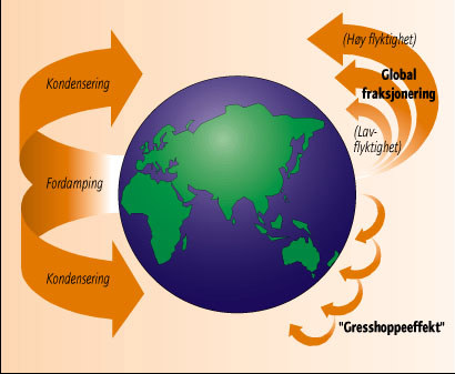Gjennom luft -og havstrømmer kan miljøgiftene transporteres over store avstander. Utslipp av miljøgifter på jordens nordlige halvkule transporteres hovedsakelig nordover. Den globale destillasjonsprosessen innebærer at visse miljøgifter i varme strøk fordamper og transporteres med luftstrømmene mot kaldere strøk der miljøgiftene kondenserer og tilføres økosystemene, jf. figur 15.5. Det er en tendens til at de mest flyktige kjemikaliene transporteres lengst. Fordampning og kondensering kan skje flere ganger på veien mot polarområdene. Langtransportert forurensning står for de største tilførslene av flere av de farligste miljøgiftene til det norske miljøet. En viktig årsak til dette er utslipp fra olje- og kullfyrte kraftverk i Europa, som blant annet fører til tilførsler av kadmium over Norge. Det antas at smelteverksindustri, metallindustri og gruvedrift bl.a. i Russland er betydelige bidragsytere til langtransporterte luftforurensninger. Det er også påvist at transport med havstrømmer fører til betydelige avsetninger av bl.a. PAH og PCB på bunnen i Norskerenna.