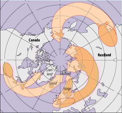 Hovedkilden til miljøgifter i Nordområdene er langtransporterte forurensninger, men også lokale kilder bidrar. Svalbard og havområdene rundt er spesielt utsatt fordi atmosfæriske forhold og Golfstrømmen fører forurensninger fra de store industrialiserte sentra i Sentraleuropa og på østkysten av Nord-Amerika til dette området, jf. figur 15.6. Forurensninger tilføres også de arktiske områdene via de store elvene som munner ut i nordområdene. Det er en lang rekke tungt nedbrytbare organiske miljøgifter som transporteres til Arktis. Om sommeren representerer bidraget fra Europa mer enn 75 prosent av de samlede tilførslene av organiske miljøgifter til Arktis. Opp til 6 prosent av det totale utslippet av metallene arsen, kadmium, bly, sink, vanadium og antimon fra hele Eurasia faller ned over Arktis. Forhøyede konsentrasjoner av de klororganiske kjemikaliene PCB, HCH, HCB, klordan og toksafen i luft er påvist både på Jan Mayen, Bjørnøya, Hopen og i Ny-Ålesund. Samtidig viser undersøkelser at nivåene av klororganiske forbindelse i næringskjedene i Barentshavet og på Svalbard er adskillig høyere enn tidligere antatt. I arter som isbjørn og sel, som befinner seg på toppen av de marine næringskjedene i Barentshavet, er det funnet noen av de høyeste gjennomsnittskonsentrasjonene av PCB i verden.