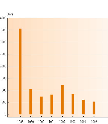 - Figur 15.8 Antall kreftfremkallende kjemikalier registrert i Produktregisteret 1988 - 1995. (Kilde: SFT/Produktregisteret)
