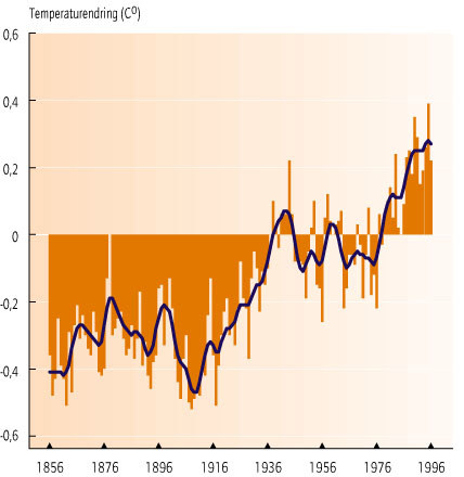 - Figur 17.1 Endringer i global middeltemperatur basert på en kombinasjon av luft over land og havoverflate-temperatur for perioden 1861 - 1996 sett i forhold til normalverdien for perioden 1961 - 1990, årlig og glattet. (Kilde: University of East Anglia, P. D. Jones/Det norske meteorologiske institutt.)