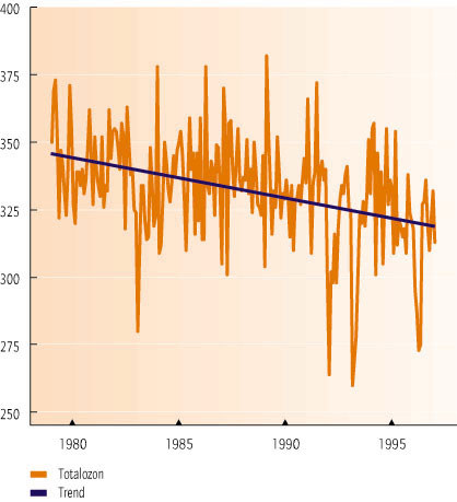 - Figur 17.11 Totalozon (stratosfærisk) korrigert for årstidsvariasjoner. Ozonmengden er redusert med ca. 0,46 prosent i året. (Kilde: SFT)