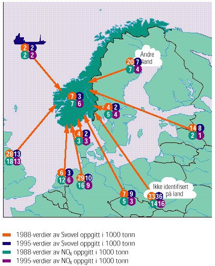 - Figur 17.13 Kilder til nedfall av svovel og nitrogen i Norge. 1988 og 1995. (Kilde: EMEP) MSC-W