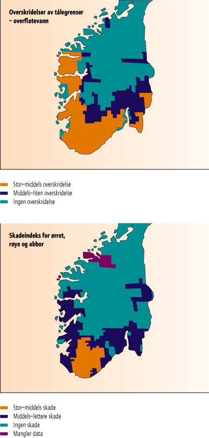 - Figur 17.14 Områder i Sør-Norge der overflatevannets tålegrense for svovel og nitrogen er overskredet og områder med skade på fiskebestander (1990). Innenfor "skade-arealet" er det betydelige skader i 27,5 prosent, moderate skader i 25,5 prosent og små skader i 46 prosent av arealet. (Kilde: NINA, NIVA)