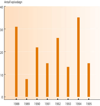 - Figur 17.15 Antall episodedøgn med ozon ved bakken 1983 - 1995. Et episodedøgn med bakkenær ozon kan medføre risiko for helseeffekter i det aktuelle området, spesielt hos personer som fra før har luftveislidelser. Episodedøgn er døgn med timesmiddelkonsentrasjon større eller lik 120 -g/m 3> på minst to stasjoner eller 200 -g/m 3> på minst en stasjon. (Kilde: NILU)