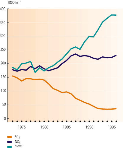 - Figur 17.17 Norske utslipp av SO 2, NO x og VOC 1973 - 1996. (Kilde: SSB/SFT.)