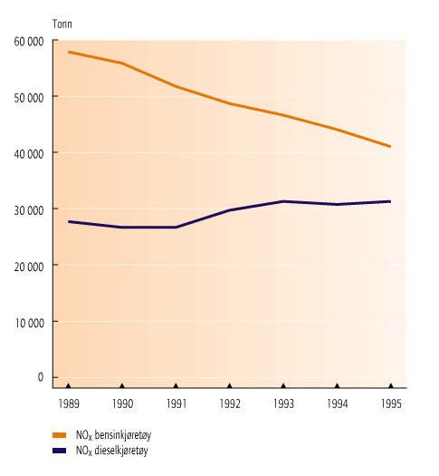 Fra 1989 til 1995 har de samlede utslippene av NO X fra vegtrafikken gått ned med 11 prosent. Dette skyldes en til dels kraftig reduksjon i utslippene fra bensindrevne kjøretøy etter innføringen av katalysatorkravet i 1989. Ytterligere reduksjon er forventet fram mot år 2000. Utslippene fra dieseldrevne biler har derimot økt i samme tidsrom pga. økt tungtransport og større andel dieselbiler. Denne veksten vil trolig begrenses etter hvert som de nye avgasskravene til tunge kjøretøy fra 1993 og 1996 får større effekt.