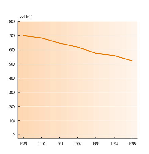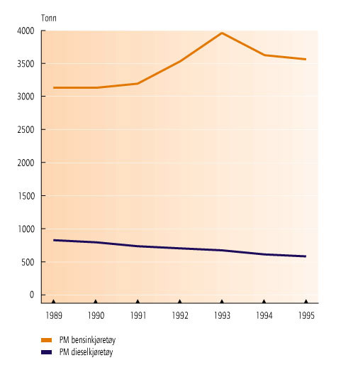 - Figur 17.19 Utslipp av eksospartikler fra kjøretøy i Norge. 1989 - 1995. Tonn. (Kilde: SSB/SFT)