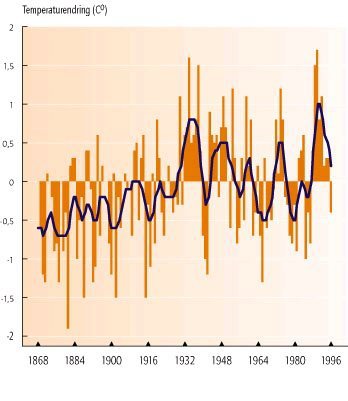 - Figur 17.2 Endringer i middeltemperatur for Norge for perioden 1868- 1996 sett i forhold til normalverdien for perioden 1961 - 1990 basert på målinger ved 9 stasjoner, årlig og glattet. (Kilde: Det Norske Meteorologiske Institutt.)
