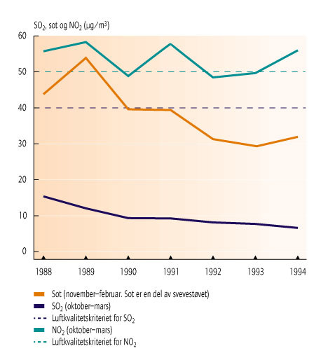 - Figur 17.22 Vintermiddelkonsentrasjoner av NO 2, sot, bly og SO 2 på åtte utvalgte målestasjoner i Fredrikstad, Oslo, Drammen, Skien, Kristiansand, Stavanger og Trondheim 1988 - 95. (Kilde: SFT)