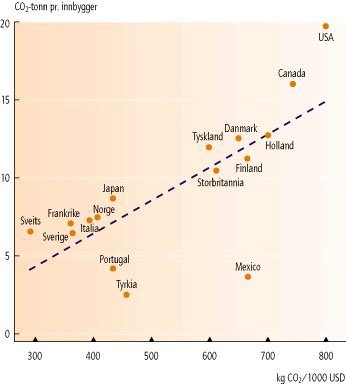 - Figur 17.5 CO 2 -utslipp pr. innbygger (tonn pr. innbygger) og CO 2 -utslipp pr. BNP enhet (kg pr. 1000 USD). OECD land 1991. (Kilde: SSB)
