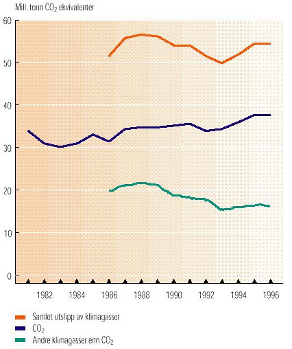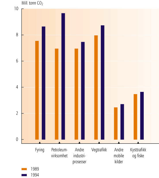 De norske utslippene av CO 2 var i 1996 40,7 millioner tonn (foreløpige tall) og lå om lag 15 prosent over nivået i 1989. De viktigste kildene til norske CO 2 utslipp er transport, petroleumsvirksomhet, fyring og industriprosesser. Norge skiller seg fra nesten ethvert annet land ved at elektrisitet produseres nesten utelukkende ved hjelp av vannkraft som ikke forårsaker CO 2-utslipp