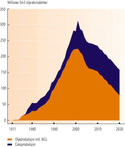 Figur 17.9 viser forventet produksjon av råolje og gass fra norsk kontinentalsokkel fram til år 2020. Råoljeproduksjonen forventes fortsatt å stige de nærmeste årene fra dagens produksjon på om lag 176 mill. Sm 3 oljeekvivalenter til om lag 215 mill. Sm 3 oljeekvivalenter i år 2000. Deretter forventes produksjonen å falle. Det er imidlertid knyttet betydelig usikkerhet til prognoser for framtidig produksjonsnivå.