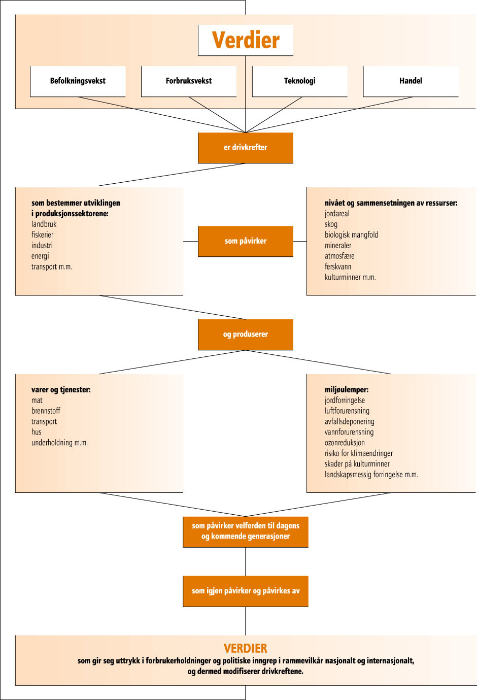 Sammenhengene i figur 2.1 gjelder globalt, men vi kan også finne dem igjen på nasjonalt og lokalt nivå. Det norske samfunnet er en integrert del av verdenssamfunnet, både ved at mange miljøproblemer krysser landegrensene og ved at den norske økonomien er åpen og innvevd i den globale. Avstanden mellom miljøbelastningene som kommer til syne og de bakenforliggende faktorene kan være stor, både geografisk og i tid. Dette er en viktig grunn til at sammenhengene kan være vanskelige å få øye på, og til at det kan være vanskelig å danne et omforent grunnlag for politisk handling. For mange av miljøutfordringene i Norge ligger likevel de viktigste drivkreftene innenfor landets grenser.