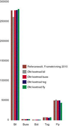 Beregningene viser at tiltak som øker prisen eller reduserer reisetiden for de lange reisene med personbil påvirker både samlet transportomfang (personkm) og bilbruken, men har mindre effekt på bruken av andre transportmidler. I figur 5.2.1a er illustrert virkningene av en kostnadsøkning på bilbruk på ca. 20 pst. En slik kostnadsøkning tilsvarer f.eks. om lag 60 pst økning av bensinavgiften. Det er også sett på en kostnadsøkning på bilbruk med 50 pst, som tilsvarer en økning i bensinavgiften med 143 pst. Heller ikke en slik prisøkning på bilbruk slår nevneverdig ut i bruken av andre transportmidler.