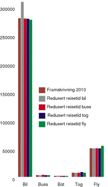 Virkningsberegningene viser endringer i reiseomfang og transportmiddelfordeling i år 2010, gitt ulike endringer i direkte økonomiske reisekostnader generelt (som følge av endringer i bensinpris, bomavgifter, kollektivsatser e.l.), og endringer i gjennomsnittlige tidskostnader (som følge av bedret framkommelighet, flere avganger i flytrafikken e.l.).