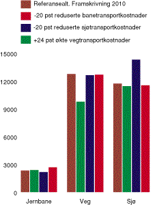 Figuren viser at effektene av tiltak er begrenset, men økte vegtransportkostnader reduserer samlet godstransportomfang og godstransport på veg sammenliknet med framskrivningene. Også godstransport på sjø reduseres som følge av økte vegtransportkostnader. Dette skyldes redusert transportomfang og avhengigheten av tilbringertransport på veg. Noe av reduksjonen i vegtransport antas å føre til økt jernbanetransport. Reduserte kostnader for sjø og jernbanetransport har liten prosentvis virkning på samlet transportarbeid og transportarbeid på veg.