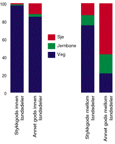 Målt i vareverdi er bildet helt annerledes. Om lag 54 pst ble fraktet med skip regnet etter vareverdi, mens bilens andel øker til nærmere 25 pst. Enda mer ekstrem er godstrafikken med fly. Tonnmengden med fly er helt ubetydelig, mens flyets andel regnet etter vareverdi utgjør mer enn 5 pst. De store forskjellene i transportmiddelfordeling regnet i tonn og vareverdi avspeiler transportformenes egenskaper. Sjøtransport, men også jernbane, er gunstig ved frakt av store volum over lange avstander. Luftfart har sine fortrinn i transport av gods der tidsfaktoren betyr mye, som f.eks. i post, avis og fisketransport over lange avstander, og ved transport av høyverdivarer.