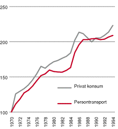 I figur 4.2.1a vises utviklingen i innenlands persontransportarbeid og samlet privat konsum målt i faste priser for perioden 1970 - 94. Som det framgår av figuren er det svært godt samsvar mellom utviklingen i de to størrelsene. Både samlet forbruk og omfanget av persontransportarbeidet er mer enn fordoblet i løpet av de siste 25 årene.