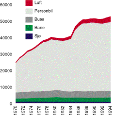 - Stagnasjon i bruk av alle andre transportmidler etter 1970, bortsett fra vekst i togtrafikken fra 1991 etter stagnasjon og nedgang i 1980-årene.