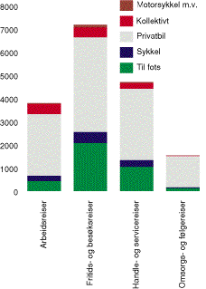 Figur 4.2.1c viser antall korte reiser (reiser under 100 km), fordelt på transportmiddel og reisens formål. Figuren er utarbeidet på grunnlag av reisevaneundersøkelsen i 1992. De korte reisene utgjør om lag 70 pst av alle reisene i Norge. De alternative transportmidlene på korte reiser er i hovedsak gange, sykkel, bil, buss, jernbane, trikk/Tbane (Oslo) og i noen grad båt, pluss kombinasjoner av disse. Kollektive transportmidler er slått sammen i figuren. Figur 4.2.1c viser transportmiddelfordeling og reiseformål i landsgjennomsnitt, men illustrerer ikke til dels store geografiske forskjeller. F.eks. er andelen kollektivreiser i Oslo-området betydelig høyere enn landsgjennomsnittet.