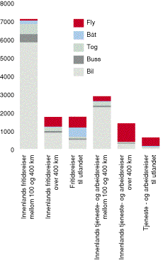 Bilen har den største andelen av både mellomlange og lange fritidsreiser. Pris betyr mer for fritidsreiser enn tjenestereiser. Båt synes i liten grad å være et alternativ til andre transportmidler, med unntak av fritidsreiser til utlandet hvor båt har en viss andel. Buss utgjør en svært liten del av de lange reisene, uansett lengde og formål.