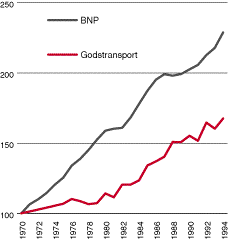 Figur 4.2.2a Godstransport og BNP 1970 - 94. 1970 = 100.