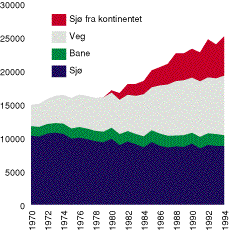 Figur 4.2.2b viser utviklingen i innenlandsk godstransportarbeid fordelt på transportmiddel i perioden 1970 - 94. De viktigste utviklingstrekkene er: