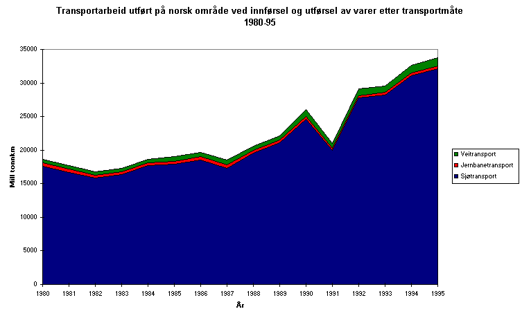 Det har vært en økning i innenlands godstransportarbeide på 44 pst. i perioden 1980-95, inkl. transport av olje fra kontinentalsokkelen. Dersom denne transporten holdes utenom, har økningen i transportarbeidet vært på 17 pst.