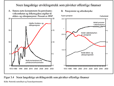 Dagens høye innbetalinger fra petroleumsvirksomheten er ikke inntekter i vanlig forstand, men en omplassering av våre olje- og gassressurser. Oppsparingen i Statens petroleumsfond har en motpost i nedbyggingen av olje- og gassreservene og inntektene derifra, som kan svinge sterkt men med sikkerhet vil falle utover i århundret. Ved å begrense bruken av oljeinntekter nå bygger vi opp reserver som vil gi avkastning når veksten i pensjonsutbetalingene for alvor tiltar etter 2015. Hvis vi derimot brukte oljeinntektene etter hvert som de fløt inn, er det grunn til å anta at statens finanser ville forverres brått rundt midten av 2020-årene, og det med en slik kraft at det ville få alvorlige konsekvenser for det offentliges tjenesteytende virksomhet og store ringvirkninger i resten av samfunnet. Kurvene på denne siden illustrerer dette klart.