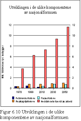 I Langtidsprogrammet 2002-2005 anslås verdien av Norges realkapital, arbeidsinnsats, finanskapital og petroleumsformue. Det er usikre fremskrivninger som ligger til grunn, med til dels utenforliggende og uforutsigbare faktorer som oljepris. Med de forutsetningene som er lagt til grunn i Langtidsprogrammet, var petroleumsformuen pr. 1.1.99 anslått til om lag 2050 mrd. kroner. Verdiene av miljø og naturressurser lar seg vanskelig måle i penger, uten at dette gjør dem mindre nødvendige for samfunnets overlevelse og vår velstand. Ikke alle miljøkomponenter kan kompenseres gjennom en økning i andre deler av formuen. Vi er blant annet avhengige av et stabilt klima og et tilstrekkelig ozonlag. Dette er grunnlaget for at føre var-prinsippet står så sentralt i miljøpolitikken. Vi må også ta vare på og videreutvikle den "sosiale kapitalen", som representerer de nettverk og normer, verdier og forståelse som deles av alle, gir samfunnet dets særpreg og er et helt nødvendig grunnlag for samhandling i ethvert samfunn. Også for dette kapitalelementet er det umulig å fastsette en verdi i kroner og øre.