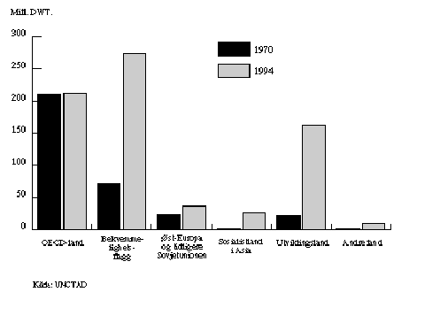 Fordeling av verdenstonnasjen fordelt på grupper av registreringsland 1970 og 1994