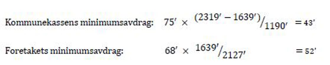 Spørsmålet er så hvordan minimumsavdraget for henholdsvis kommunekassen og foretaket skal beregnes. Kommuneloven § 14-18 første ledd andre punktum slår fast: