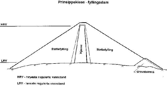 Figur 8.1 Figur 8.1: Prinsippskisse - fyllingsdam, med angivelse av høyeste regulerte vannstand (HRV), og laveste regulerte vannstand (LRV)