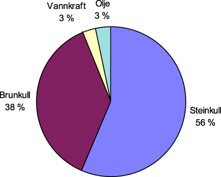 Over 90 prosent av den totale kraftproduksjonen er basert på kull. Steinkull har en andel på 56 prosent, mens brunkull har en andel på 38 prosent, se figur 9.17. Brunkull blir utelukkende brukt til kraftproduksjon. I tillegg kommer moderate innslag av vannkraft og oljekraft.