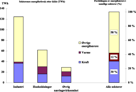 Elforbrukets andel av det totale stasjonære energiforbruket er bare 14 prosent, se figur 9.16. Varmeforbruket er av samme størrelsesorden. Industriens andel av det stasjonære energiforbruket er i overkant av 40 prosent og noe høyere enn husholdningenes andel.