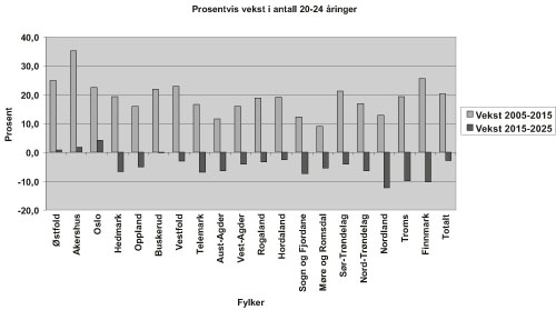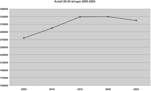 Folketallet vil stige, og fram til 2015 vil det skje en sannsynlig vekst i aldersgruppen fra 20 til 24 år på ca. 20 %. Deretter vil utviklingen flate ut, med en sannsynlig reduksjon på 3 % i perioden 2015 – 2025. Dette er vist i figur 4.1.