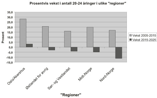 Figur 4.3 Befolkningsutviklingen i aldersgruppen 20 – 24 år fram til 2025 fordelt på ulike deler av landet («regioner»).