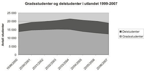 De siste årene har det skjedd en nedgang i antall norske studenter som tar en hel grad i utlandet, fra rundt 15 000 i 2001 – 2003 til i overkant av 12 000 i 2007. Fra 1999 til 2005/2006 var det samtidig en jevn vekst i antall delstudenter fra rundt 4000 til over 7000, men for året 2006/2007 er antallet sunket til omtrent 6500. Se figur 4.4 for utviklingen fra 1999 til 2007.