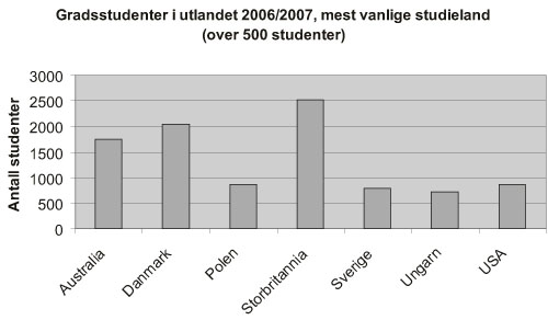 Norge plasserer seg sammen med Sverige på topp blant de nordiske landene når det gjelder antall utreisende studenter. I 2004/05 var 5,6 % av den samlede studentmassen i de to landene gradsstudenter i utlandet, mot 1,4 % i Danmark og Finland. Nordiske studenter reiser i stor grad til de samme landene. 34