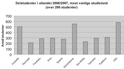 Studentene fordeler seg ujevnt på ulike land. For dem som tar hele graden i utlandet i studieåret 2006/2007, er fordelingen for de mest populære studielandene gitt i figur 4.5. Også for dem som er utvekslingsstudenter (delstudenter), er fordelingen ujevn. For de drøyt 6500 studentene som faller i denne gruppen i studieåret 2006/2007, er fordelingen for de mest populære studielandene gitt i figur 4.6.