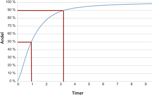 Analysen har fokusert på det som er brukt av politiets innsatsressurser (operativt personell). Denne ressursen utgjør førstelinjen til politiet og er døgnkontinuerlig tilgjengelig. På de oppdragene som er registrert med bruk av ressurs, fremkommer aktiv tid. Den kan variere fra noen få minutter til mange dager. Oppdragene får derfor sin unike «aktiv tid» registrert. Når man tar for seg antallet ganger samme aktive tid fremkommer gir det resultatet som vist i tabell 6.4 nedenfor. Her er alle 94 282 avsluttede oppdrag med forholdets art nivå 2 «sykdom, psykiatri» hvor det er benyttet en ressurs fra politiet, sammenstilt med hensyn på hvor mange prosent antallet ganger aktiv tid i timer fremkommer.