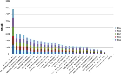 Det største antall oppdrag i ett år i perioden 2005 – 2009 i det enkelte politidistrikt.