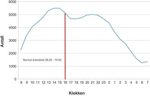 Man kan ikke forklare økt ventetid alene med økningen av antall oppdrag registrert som «sykdom/ psykiatri», til det er antallet for lite. Organisering av når og hvor ressurser skal være tilgjengelig, er helt avgjørende for å redusere ventetiden, jf. figur 6.4, som viser sammenhengen mellom når «sykdom, psykiatri»-oppdrag skjer, og når innsatspersonell som går turnus, er på jobb. Hva de gjør er avgjørende for i hvilken grad de påvirker.
