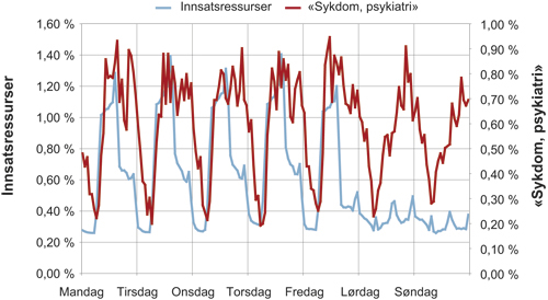 Figur 6.4 Forholdet mellom når «sykdom/ psykiatri»-oppdrag skjer, og når innsatsressurser er tilgjengelige