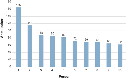 Figur 6.5 Antall forhold registrert i PO for de 10 gjerningspersonene dømt etter § 233 med flest registreringer før drapstidspunktet