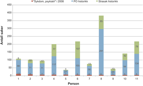 En gjennomgang av 11 personer med registrerte forhold «sykdom, psykiatri» i 2008 i Oslo viste at samtlige personer hadde et betydelig antall saker registrert både i PO og i STRASAK (figur 6.6).